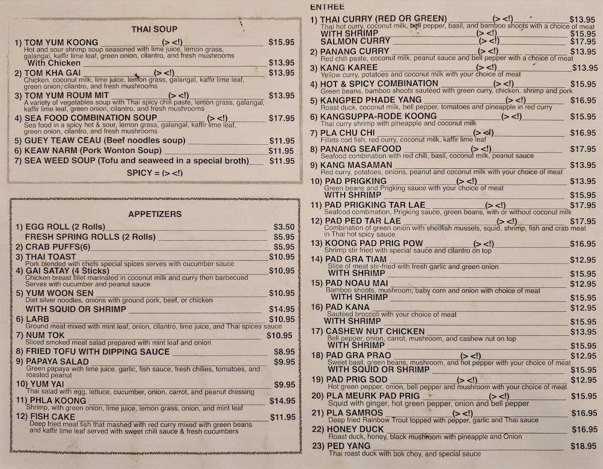 For those who have a knack for adventurous flavors, the Red, Green, and Yellow Curries showcase an explosion of taste that is both comforting and heartwarming, often reminding visitors of home-cooked meals made with love. Meanwhile, refreshing options like the papaya salad add a crunchy, zesty kick that rounds out the experience beautifully. Pair your meal with some Thai Iced Tea for the perfect finish, as its sweetness complements the savory bites splendidly.